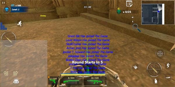 5、玩家可以利用虚拟键盘控制角色移动,右下方的按键可以进行射击、换弹、半蹲、趴下等多种功能;