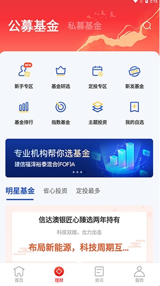 2、我们来到【理财】页面,可以更好地了解到这方面的功能内容,例如基金研选、定投专区等。