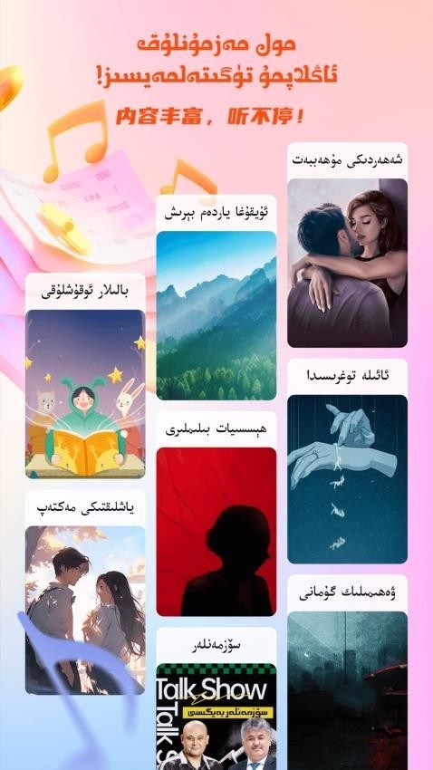 sada fm维声书是一款专为维吾尔族人们提供的有声书播放软件,它涵盖了小说、广播剧和博客等内容,让大家可以收听自己语言版的有声FM。软件内支持维语和中文切换,你想听什么都能免费收听,海量书籍任你挑选。并且,软件内的内容会实时更新,保证用户能收听自己喜欢的内容哦!