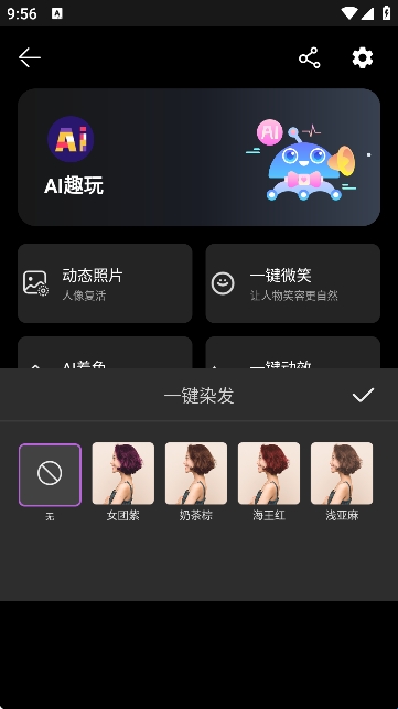 5、例如【一键染发】,如图所示。这里能提供丰富的染发效果,然后点击右上角的【√】完成。