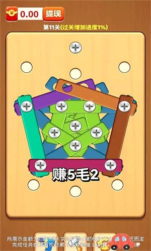 好运打螺丝是一款做到真正提现的休闲闯关小游戏。游戏玩法特别简单,每一关都会给出不同的图案,玩家需要按照顺序拆除螺丝,将固定的木板全部拆除,这样便能过关。游戏内置多种道具,助力玩家顺利闯关,领取丰厚的红包奖励。有兴趣的朋友们快来下载游玩吧。