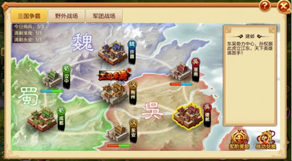 三国有各自的势力范围,吴国的势力范围位于东部沿海一带,国都为建邺;蜀国地处西部内陆巴蜀地区,国都在成都;魏国雄踞长江以北的广大中原地区,国都为许昌。三国各霸一方,相互对峙,形成鼎立局面,我们可以根据自己的喜好和心情自由选择。