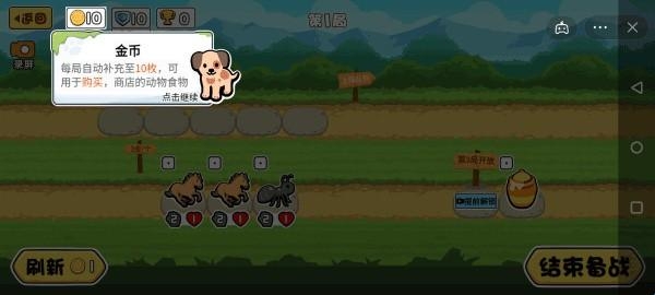 1、首先在动物之战里,每局都会自动补充10枚金币,这些金币可以用来购买商店里的动物食物。