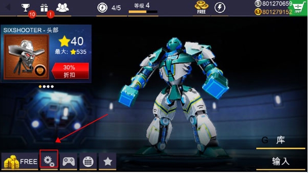2、简单的过一下新手教程,然后在主界面下方的菜单栏选择“齿轮”设置,如下图箭头指向位置处。