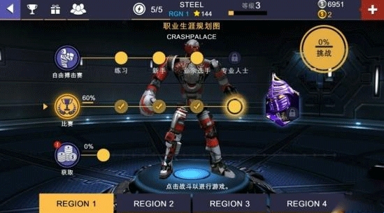 2、点击地图,里面有三个大分类,自由搏击、比赛和获取(氪金患者必备),难度也是逐渐增加。自由搏击主要是让玩家熟悉游戏的操作,让玩家尽快上手。