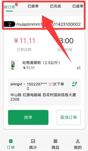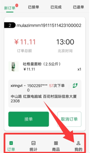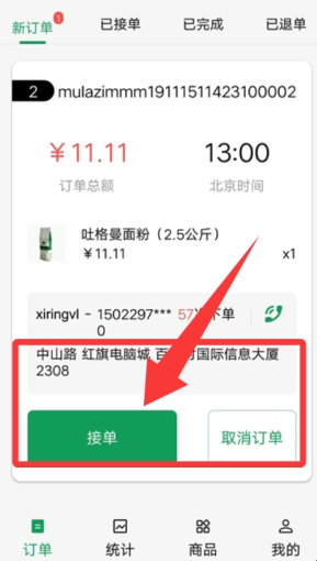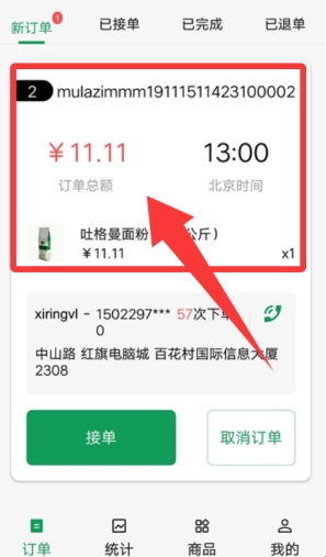 4、有了新的订单可以选择接单或是取消订单,商家可以体验选择性的接单方式;