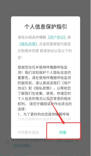 1、确认接受用户协议后,即可进入应用主界面。此操作代表您已了解相关须知,准备使用健康监测服务。