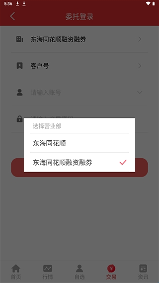 2、可以看到在打开的交易登录页面中是委托登录,而且只能选择东海证券资金账号的类型进行登录