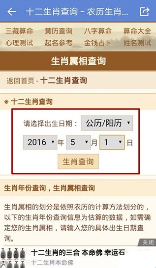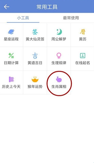 2、在常用工具中,点击生肖属相,进入查询界面;
