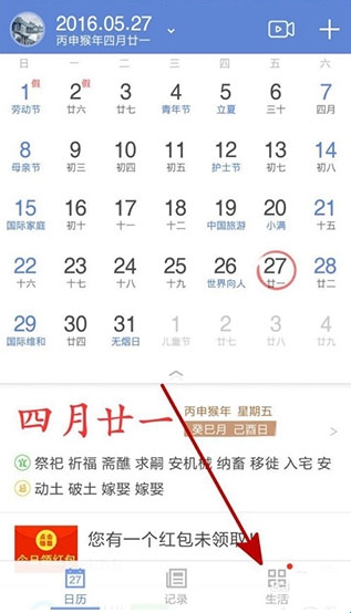 1、打开中华万年历,右下角点击进入生活,在生活右上角点击计入常用工具;