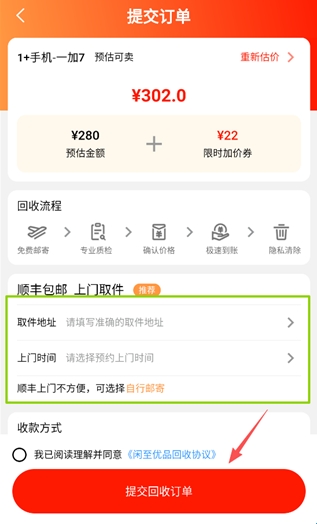 选择回收方式:顺丰上门取件或自行邮寄,并填写取件地址及预约上门时间,点击【提交回收订单】,等待顺丰上门取件或自行邮寄完成回收流程。