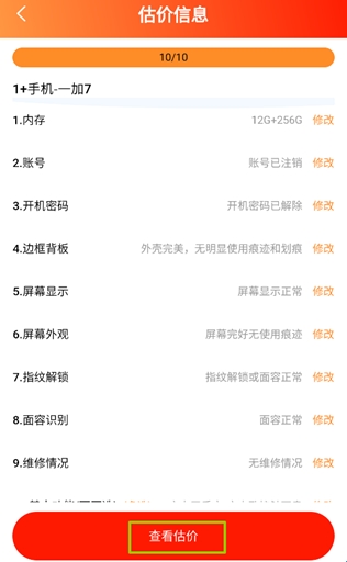 按页面提示填写机身内存、账号状态、开机密码、边框背板、屏幕显示/外观、指纹/面容识别、维修情况等10项信息完成后点击【查看估价】。