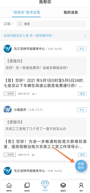 2、在【我帮你】页面,点击右下角蓝色【我要提问】按钮,进入提问编辑界面。
