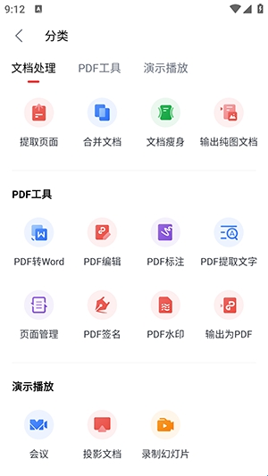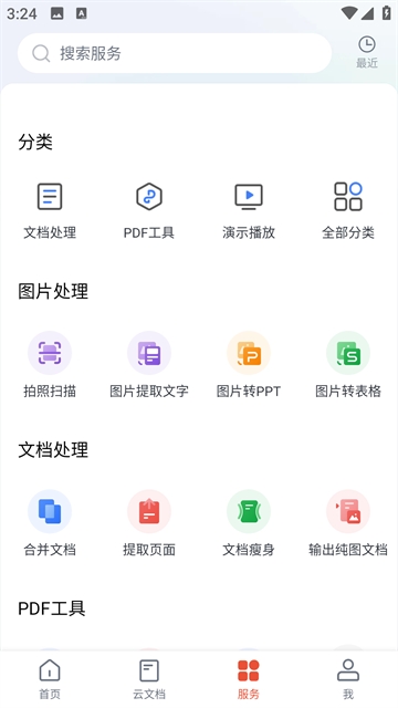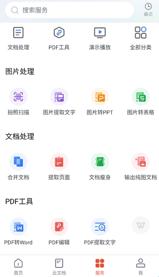 6、服务板块展示WPS Office Pro App的各种功能如:图片处理、文档处理、PDF工具等核心功能模块。