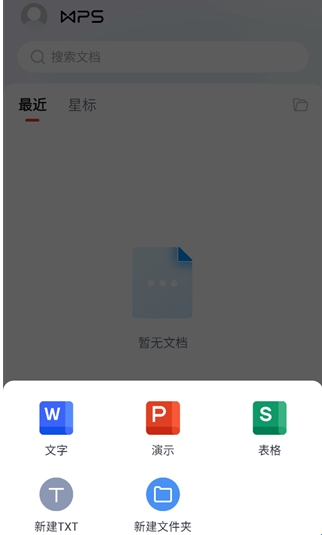 2、在弹出新建选项,可选择文字、演示、表格、TXT、文件夹等类型。