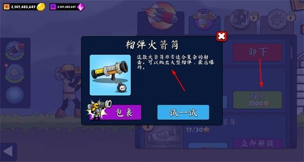 1、首先下载安装好祖卡爆炸火箭筒游戏,进入武器界面后,你可以查看新武器的相关介绍,也能选择“试一试”来体验其效果,还可以借助包裹功能管理自己已拥有的武器。
