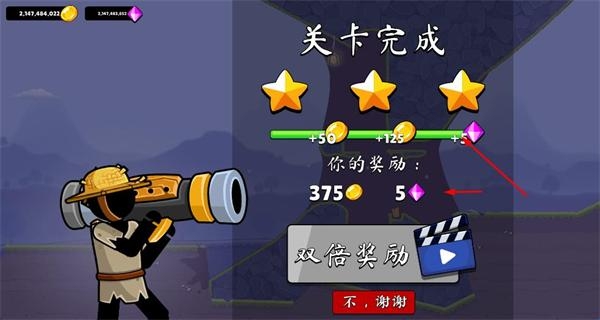 4、完成关卡后,能得到对应星级的金币和钻石奖励。要是选择双倍奖励,观看视频就能让收益翻倍,也可以直接关闭界面。