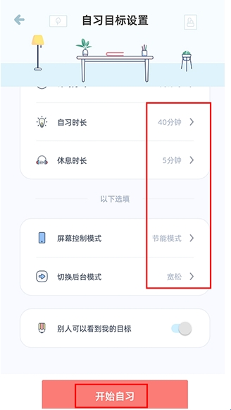 4、设置自习时间,设置完成后,点击【开始自习】;