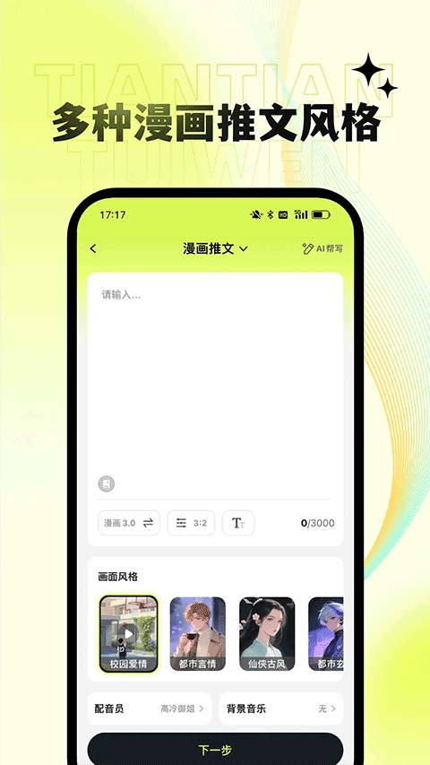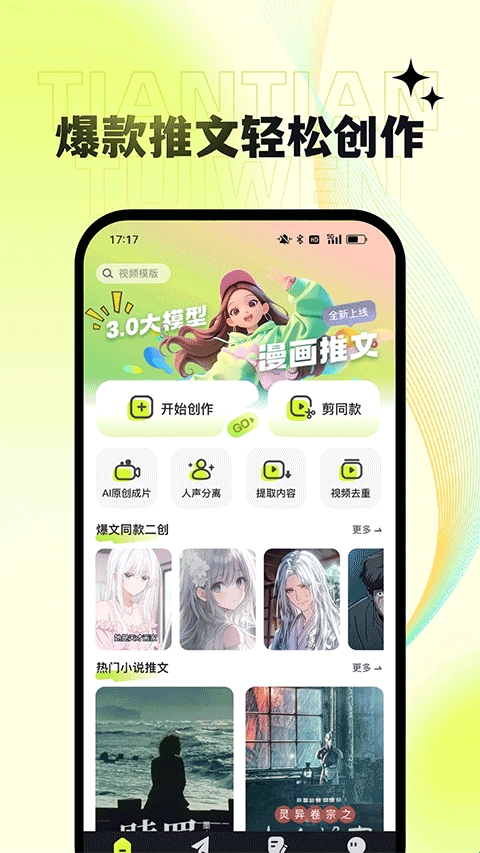 2、丰富资源支持:从热门视频素材到经典漫画模板,天天推文拥有海量资源供用户选择,满足不同类型的创作需求。