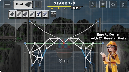 造桥模拟器,一款如同解谜一般的桥梁模拟建造类手游。游戏十分的考验玩家们的工程设计能力,根据每一关的要求,从承重、稳定性等各个方面考虑,利用不同的建材制造出一座坚固的桥梁,让车辆能够顺利的通过!游戏中设计了丰富的场景可以去挑战,每一个场景都有着多样的关卡可以挑战,让你能够去设计各种桥梁,体验设计工程的快乐!