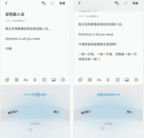 随口说了句「我正在用普通话测试豆包输入法」,一字不差,再来一句英文「Attention Is All You Need」,也准确识别了。