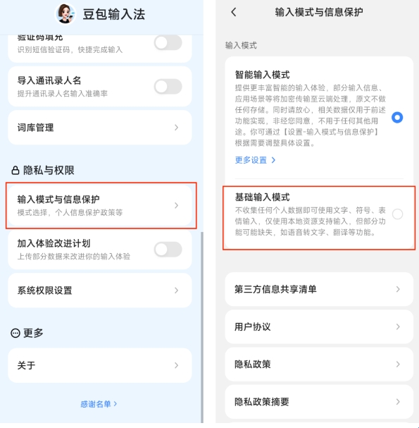 当然了,选择一款新的输入法,很多人会担心隐私问题,豆包输入法提供了一个「基础输入」模式,只是打开之后,语音转文字、翻译这些功能就全关了。