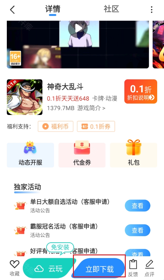 3、进入游戏的详情页,点击下方的立即下载按钮(云玩是云游戏,需要排队、收费)。