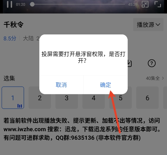 3、首次投屏会提示开启悬浮窗权限,点击【确定】并按指引开启,即可顺利完成投屏。