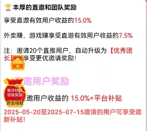 3、邀请系统:下线提现1你得1然后就是3得1、10得2、20得3,40得4、70得6、100得6,这个属于累计的不是单独计算的这点还是不错的。另有15%的金币奖励,外卖的7.5%。