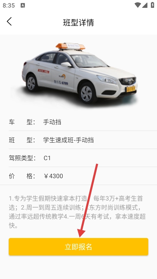 在班型详情页面,您能够查看车型相关信息,确认信息准确无误后,点击【立即报名】按钮,即可进入在线报名页面。