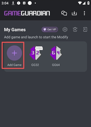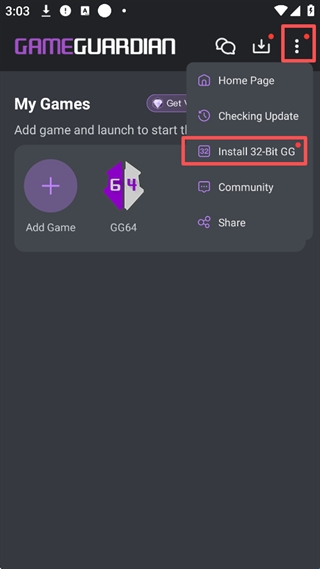 1、打开GG修改器可以看到只有一个64位,如果想安装32位就要点击【右上角三个点的图标】点击【Install 32-Bit GG】安装