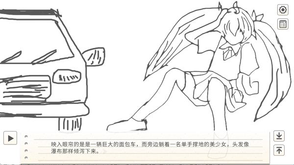 部分剧情将以简笔画形式进行可视化呈现,例如美少女在面包车旁摔倒的场景。该环节无需玩家操作,主要用于辅助表现剧情氛围,玩家可借此观察画面与文本的契合度,为后续创作提供灵感。