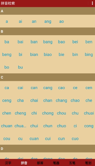 3、快速查找分类:拼音、部首、笔画包含多种分类