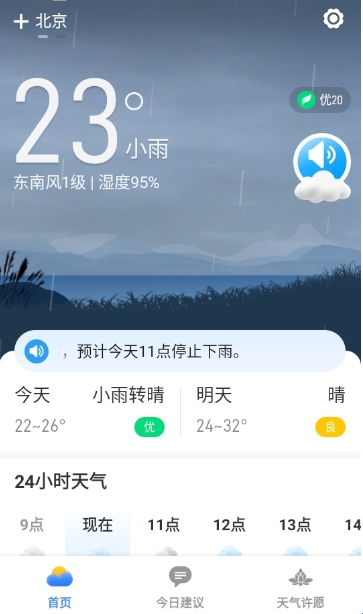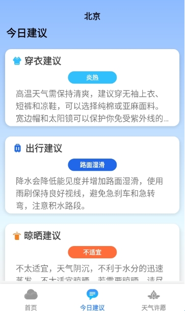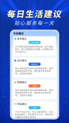 天气预报智能报,一款功能强大的天气预报软件,平台接入中国气象局及多家权威数据资源,能准确预测15日内的天气,方便用户提前安排出计划。软件会实时更新当日天气,让天气变化尽在掌握。此外软件还自带每日生活建议,为用户贴心服务每一天。需要这款软件的朋友,快来下载吧。