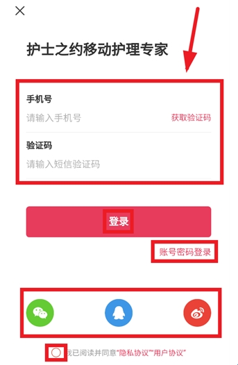2、进入登录界面后,输入手机号,验证码,勾选我已阅读并同意“隐私协议用户协议,点击登录即可,还可以点击账号密码登录使用手机号,密码登录,以及点击下方微信,qq,微博图标进行第三方授权登录。