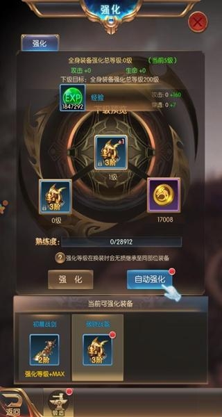 1、直接强化:进入各装备的页面均有一键提升功能自动消耗所需耗材强化装备