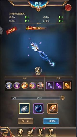 2、神兵:解锁神兵的技能可增加不同的角色属性加成。