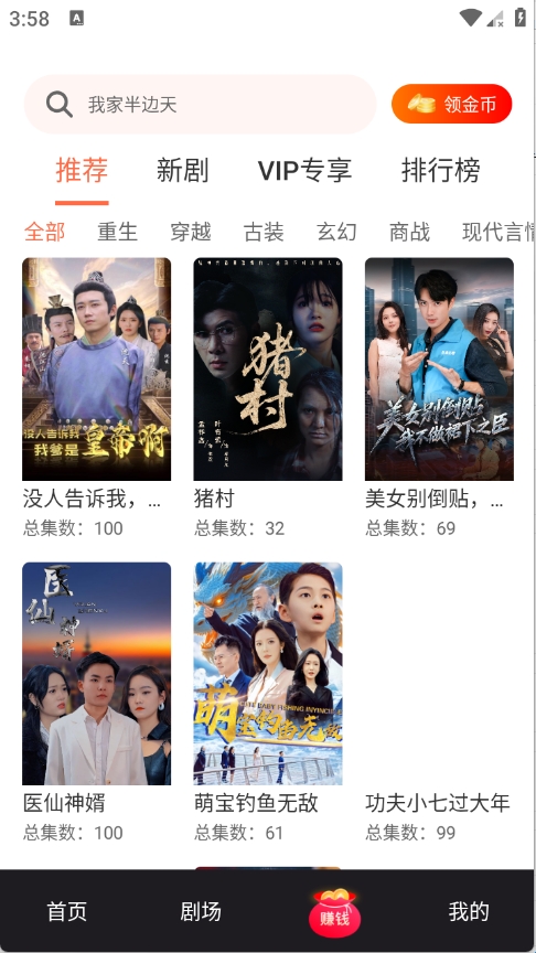 3、剧场页面将短剧进行了详细的归类,重生、穿越以及玄幻等题材类型。