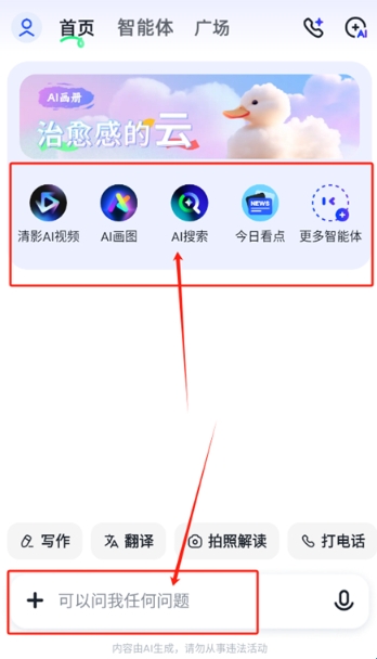 2、进入首页可以看到丰富的功能,在下方对话框可以输入任何问题,AI助手都能快速为您解答;