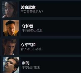 如选择得当可在同一条流程线里依次获得这四个成就,即①一直讨好梅玲然后去旅馆亲吻②亲吻后从窗户逃出,但不要信任梅玲把碗给她,被蔡家审问时一直选择保护梅玲③街上遇到混混时不要动手④到了医院选择暴力威胁但是不越过底线。