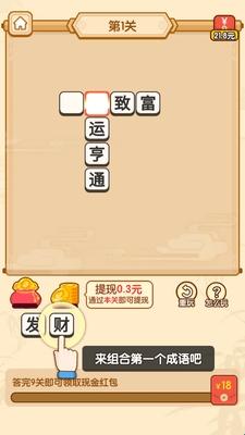 1、全新的猜成语闯关玩法,只要连续猜对就能够不断的尝试下一关增加金币收益