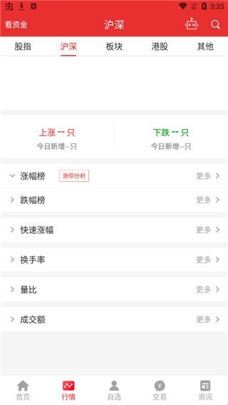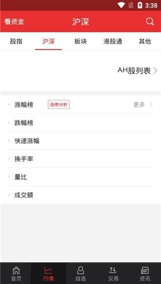 2、点击行情,用户可以随意查看股市的的涨幅榜、跌幅榜、成交金额等等
