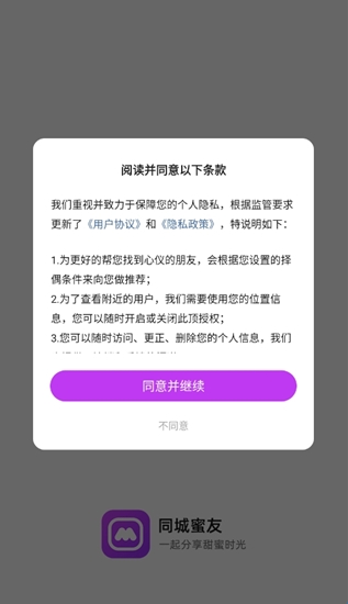 1、下载同城蜜友,安装好后打开可以看到如下弹窗,点击同意并继续。