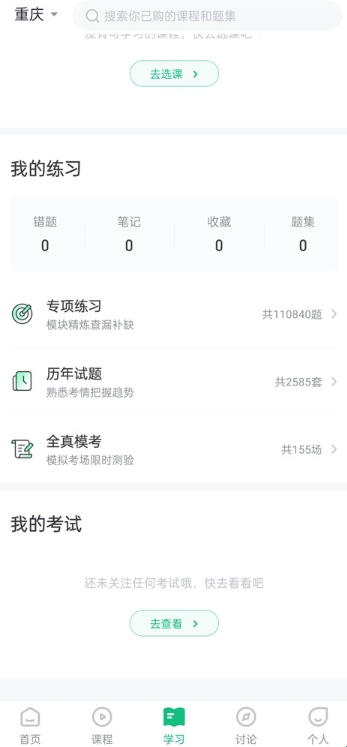 2、进入到学习页面,点击我的练习下方的“历年试题”选项;