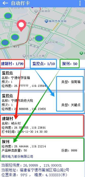 进入中邮揽投APP的新功能【自动】,界面中部会有显示当日合并打卡反馈的任务数据和已完成的数量(包含:建制村、外勤监控点、信筒箱监控点、报刊等)。当进入打卡范围圈蓝色内时,APP会自动进行打卡操作,并在中部展示各类型数据的打卡数量。