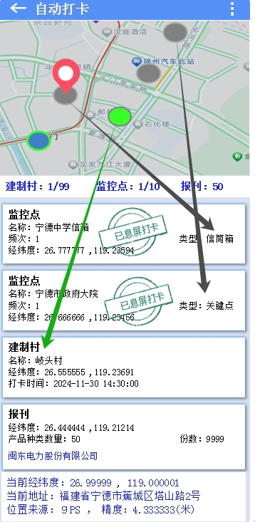 打卡后,监控点和建制村的状态标识为“已息屏打卡”,同时打卡成功的范围由(蓝色圆圈)会变成(灰色圆圈)(如下图5);则报刊总数据则会自动打卡消失;点击未打卡的数据条,对应的打卡范围则变成(绿色圆圈)(如下图)。