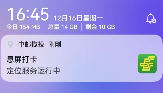 ① “息屏打卡”开/关: PDA或者手机在设备屏幕息屏的情况下,可实现自动打卡采集。如果点开,PDA或手机的程序外屏上部会有显示“中邮揽投.息屏打卡,定位服务运行中”如下图。