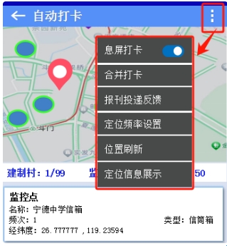 在【自动打卡】界面右上角“┇”按钮如下图,点击后会弹出六个选项,具体功能和使用说明如下:
