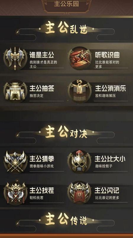 2、主公趣味乐园:集成多个以“主公”为主题的轻量级小游戏,如消除类游戏“主公消消乐”、决策类游戏“谁是主公”及音乐互动游戏“听歌识曲”等。