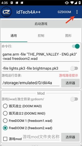 6、“Mod”一栏中选择“FreeDOOM 2 (freedoom2.wad)”,底下点击“选择mod文件”,选择“THE_PINK_VALLEY-ENG.pk3”后确认;